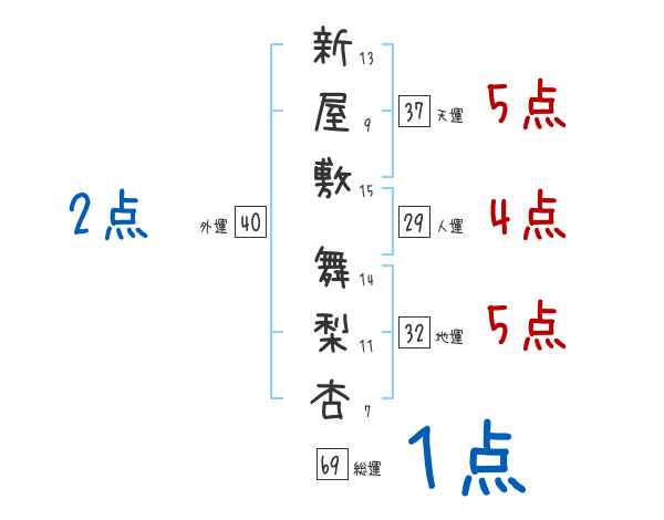 外運![]() | 新屋敷舞梨杏さんの外運は40画の2つ星!自信過剰で物事に固執するためトラブルに注意。 生活面を象徴する運勢です。外部から受ける影響力を表し、結婚運、家庭運や職場、環境への順応性を表します。 |