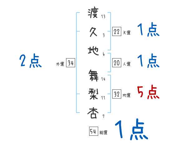 地運![]() | 渡久地舞梨杏さんの地運は32画の5つ星!柔軟性があり成功する。チャンスが多く金運が良い。 個性を表す基礎的な運勢です。性格形成や対人関係、行動力など家庭環境に影響されます。主に誕生してから20歳くらいまでの若年期の運勢を表します。 |