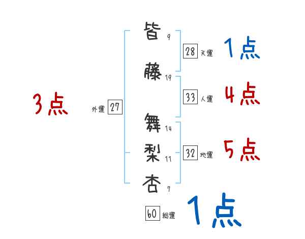 天運![]() | 皆藤舞梨杏さんの天運は28画の1つ星!家庭環境に注意。スポーツで活躍できる能力があるかも。 家系が持つ宿命的な運勢を表します。祖先から受け継いだ苗字ですので自分の力が及びません。家柄を象徴します。 |