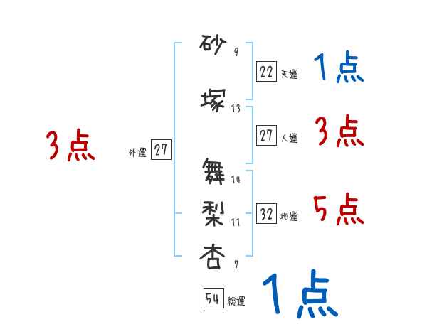 外運![]() | 砂塚舞梨杏さんの外運は27画の3つ星!頭脳明晰だが強情で摩擦が多い傾向。孤立に注意。 生活面を象徴する運勢です。外部から受ける影響力を表し、結婚運、家庭運や職場、環境への順応性を表します。 |