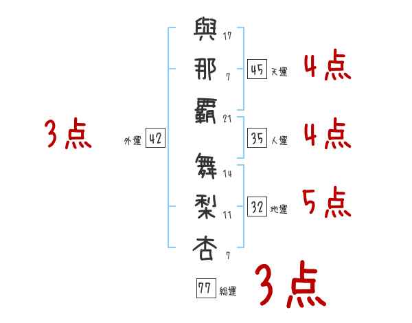 外運![]() | 與那覇舞梨杏さんの外運は42画の3つ星!病気に注意。多芸であるが消極的でおとなしい。 生活面を象徴する運勢です。外部から受ける影響力を表し、結婚運、家庭運や職場、環境への順応性を表します。 |