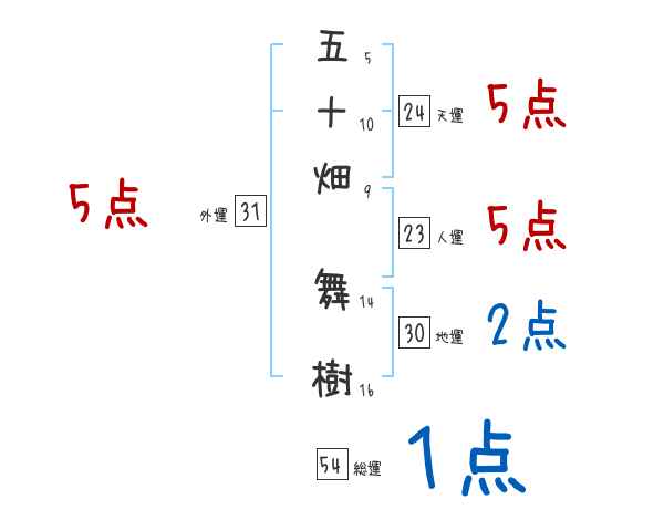 人運![]() | 五十畑舞樹さんの人運は23画の5つ星!想像力に優れ活力がある。一代で成功し名誉を手に入れる。 性格や才能などを表す2番目に重要な運勢です。人間関係や協調性、社会的な成功に影響します。主に20歳から50歳ぐらいまでの中年期の運勢を表します。 |
