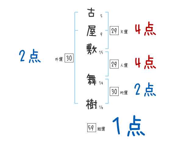 天運![]() | 古屋敷舞樹さんの天運は29画の4つ星!完全主義で才能がある。厳格な心の持ち主。 家系が持つ宿命的な運勢を表します。祖先から受け継いだ苗字ですので自分の力が及びません。家柄を象徴します。 |