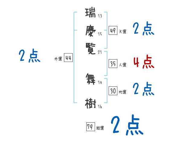 天運![]() | 瑞慶覧舞樹さんの天運は49画の2つ星!不安定な性格で明暗がある人生。周りの人には支援されやすい。 家系が持つ宿命的な運勢を表します。祖先から受け継いだ苗字ですので自分の力が及びません。家柄を象徴します。 |