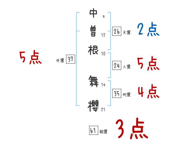 外運![]() | 中曽根舞櫻さんの外運は37画の5つ星!努力家で順応性に優れる。現実的な考え方ができ忠実に物事をこなす。 生活面を象徴する運勢です。外部から受ける影響力を表し、結婚運、家庭運や職場、環境への順応性を表します。 |