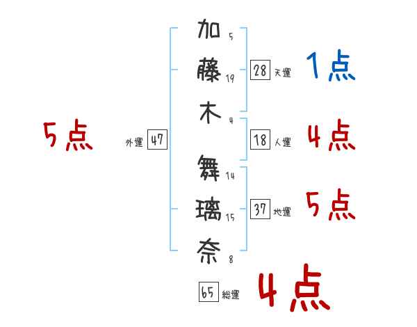 外運![]() | 加藤木舞璃奈さんの外運は47画の5つ星!実力が開花し発展する円満な人生。財に恵まれる。 生活面を象徴する運勢です。外部から受ける影響力を表し、結婚運、家庭運や職場、環境への順応性を表します。 |