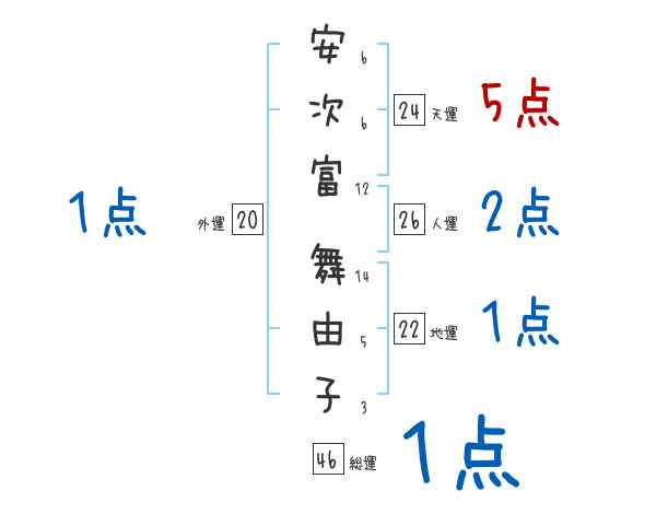 総運![]() | 安次富舞由子さんの総運は46画の1つ星!迷走することが多く苦労するかも。目先のことにとらわれないように。 あなたの人生を表す1番重要な運勢です。生涯を通じて影響する総合運となり、主に50歳以降の晩年期に影響を及ぼします。 |