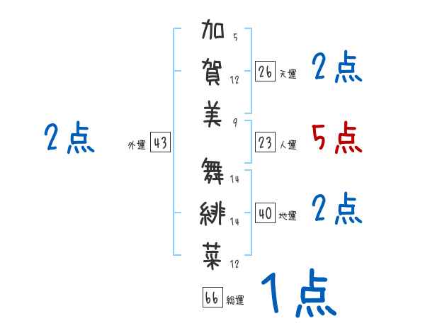 人運![]() | 加賀美舞緋菜さんの人運は23画の5つ星!想像力に優れ活力がある。一代で成功し名誉を手に入れる。 性格や才能などを表す2番目に重要な運勢です。人間関係や協調性、社会的な成功に影響します。主に20歳から50歳ぐらいまでの中年期の運勢を表します。 |
