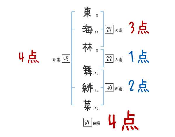人運![]() | 東海林舞緋菜さんの人運は22画の1つ星!努力することが苦手ないっぽう手先が器用。芸術性にも優れる。 性格や才能などを表す2番目に重要な運勢です。人間関係や協調性、社会的な成功に影響します。主に20歳から50歳ぐらいまでの中年期の運勢を表します。 |