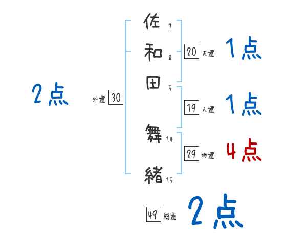 総運![]() | 佐和田舞緒さんの総運は49画の2つ星!不安定な性格で明暗がある人生。周りの人には支援されやすい。 あなたの人生を表す1番重要な運勢です。生涯を通じて影響する総合運となり、主に50歳以降の晩年期に影響を及ぼします。 |