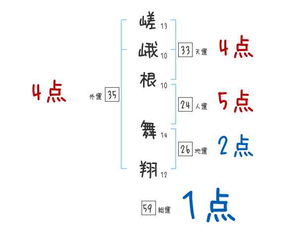 天運![]() | 嵯峨根舞翔さんの天運は33画の4つ星!権力志向でプライドが高い。勇気があり運を切り開き成功する。 家系が持つ宿命的な運勢を表します。祖先から受け継いだ苗字ですので自分の力が及びません。家柄を象徴します。 |