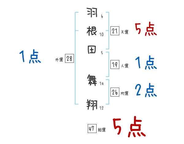 外運![]() | 羽根田舞翔さんの外運は28画の1つ星!家庭環境に注意。スポーツで活躍できる能力があるかも。 生活面を象徴する運勢です。外部から受ける影響力を表し、結婚運、家庭運や職場、環境への順応性を表します。 |