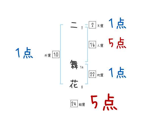人運![]() | 二舞花さんの人運は16画の5つ星!人望が厚く大きく発展する。逆転成功が見える。 性格や才能などを表す2番目に重要な運勢です。人間関係や協調性、社会的な成功に影響します。主に20歳から50歳ぐらいまでの中年期の運勢を表します。 |