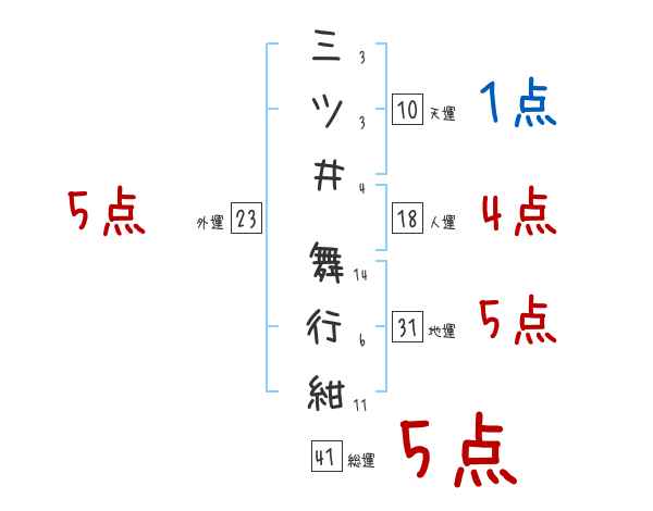 地運![]() | 三ツ井舞行紺さんの地運は31画の5つ星!社交性があり判断力に優れる。順風満帆な人生で円満な生活。 個性を表す基礎的な運勢です。性格形成や対人関係、行動力など家庭環境に影響されます。主に誕生してから20歳くらいまでの若年期の運勢を表します。 |