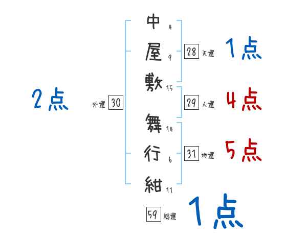 天運![]() | 中屋敷舞行紺さんの天運は28画の1つ星!家庭環境に注意。スポーツで活躍できる能力があるかも。 家系が持つ宿命的な運勢を表します。祖先から受け継いだ苗字ですので自分の力が及びません。家柄を象徴します。 |