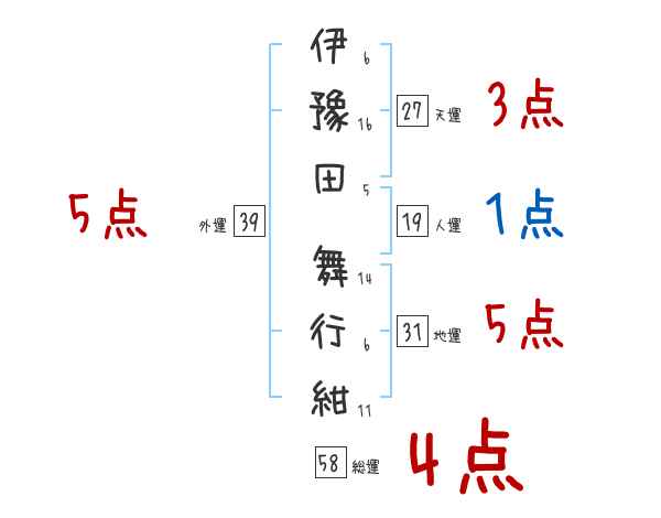総運![]() | 伊豫田舞行紺さんの総運は58画の4つ星!安定した生活。大器晩成タイプ。 あなたの人生を表す1番重要な運勢です。生涯を通じて影響する総合運となり、主に50歳以降の晩年期に影響を及ぼします。 |