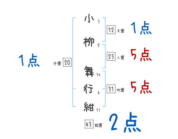 人運![]() | 小栁舞行紺さんの人運は23画の5つ星!想像力に優れ活力がある。一代で成功し名誉を手に入れる。 性格や才能などを表す2番目に重要な運勢です。人間関係や協調性、社会的な成功に影響します。主に20歳から50歳ぐらいまでの中年期の運勢を表します。 |