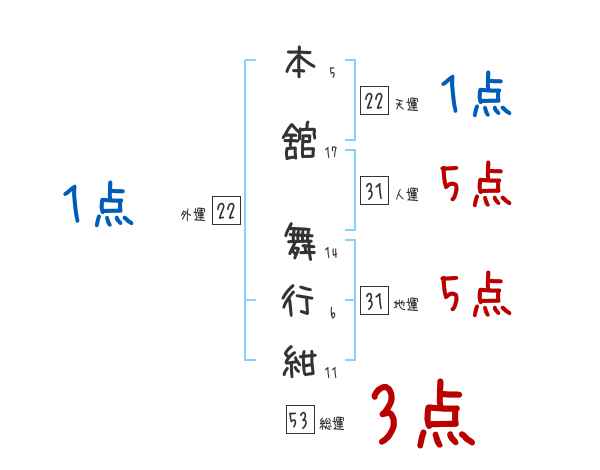天運![]() | 本舘舞行紺さんの天運は22画の1つ星!努力することが苦手ないっぽう手先が器用。芸術性にも優れる。 家系が持つ宿命的な運勢を表します。祖先から受け継いだ苗字ですので自分の力が及びません。家柄を象徴します。 |
