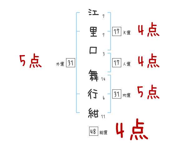 天運![]() | 江里口舞行紺さんの天運は17画の4つ星!積極的な行動力。地位を気づき財産を手に入れる。純粋な心と直感力。 家系が持つ宿命的な運勢を表します。祖先から受け継いだ苗字ですので自分の力が及びません。家柄を象徴します。 |