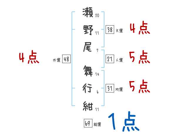 地運![]() | 瀬野尾舞行紺さんの地運は31画の5つ星!社交性があり判断力に優れる。順風満帆な人生で円満な生活。 個性を表す基礎的な運勢です。性格形成や対人関係、行動力など家庭環境に影響されます。主に誕生してから20歳くらいまでの若年期の運勢を表します。 |