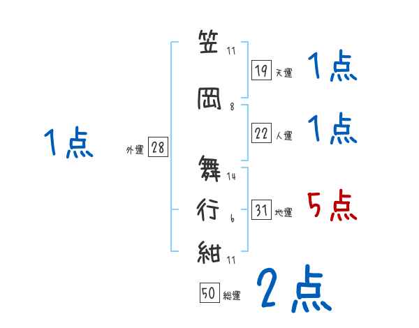 人運![]() | 笠岡舞行紺さんの人運は22画の1つ星!努力することが苦手ないっぽう手先が器用。芸術性にも優れる。 性格や才能などを表す2番目に重要な運勢です。人間関係や協調性、社会的な成功に影響します。主に20歳から50歳ぐらいまでの中年期の運勢を表します。 |