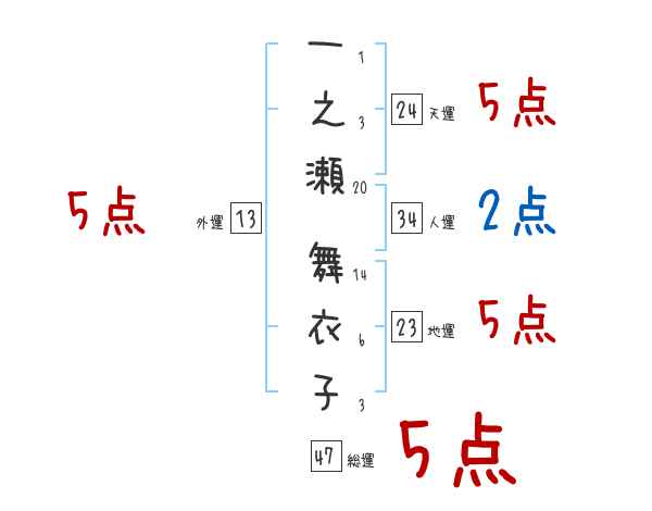 総運![]() | 一之瀬舞衣子さんの総運は47画の5つ星!実力が開花し発展する円満な人生。財に恵まれる。 あなたの人生を表す1番重要な運勢です。生涯を通じて影響する総合運となり、主に50歳以降の晩年期に影響を及ぼします。 |
