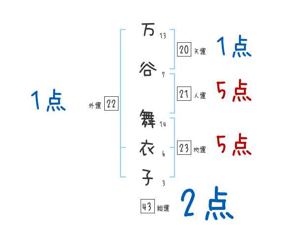 外運![]() | 万谷舞衣子さんの外運は22画の1つ星!努力することが苦手ないっぽう手先が器用。芸術性にも優れる。 生活面を象徴する運勢です。外部から受ける影響力を表し、結婚運、家庭運や職場、環境への順応性を表します。 |
