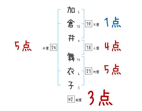 外運![]() | 加倉井舞衣子さんの外運は24画の5つ星!家庭運が良く順調な人生。金運にも恵まれる。 生活面を象徴する運勢です。外部から受ける影響力を表し、結婚運、家庭運や職場、環境への順応性を表します。 |