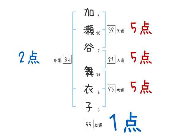 天運![]() | 加瀬谷舞衣子さんの天運は32画の5つ星!柔軟性があり成功する。チャンスが多く金運が良い。 家系が持つ宿命的な運勢を表します。祖先から受け継いだ苗字ですので自分の力が及びません。家柄を象徴します。 |
