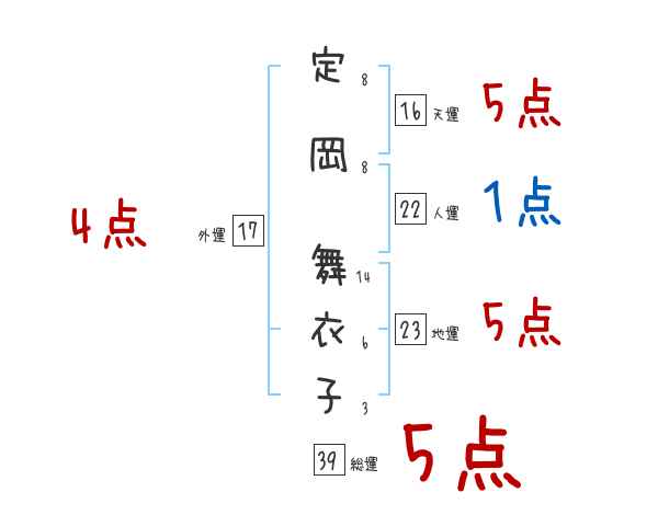 総運![]() | 定岡舞衣子さんの総運は39画の5つ星!社交性に優れ人望が厚い。人の上に立ち成功する。 あなたの人生を表す1番重要な運勢です。生涯を通じて影響する総合運となり、主に50歳以降の晩年期に影響を及ぼします。 |