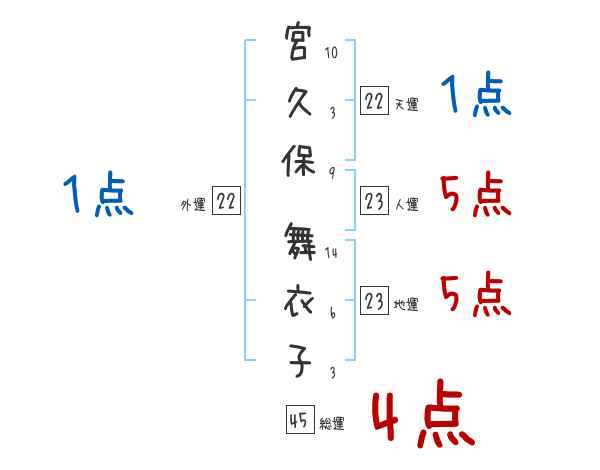 外運![]() | 宮久保舞衣子さんの外運は22画の1つ星!努力することが苦手ないっぽう手先が器用。芸術性にも優れる。 生活面を象徴する運勢です。外部から受ける影響力を表し、結婚運、家庭運や職場、環境への順応性を表します。 |