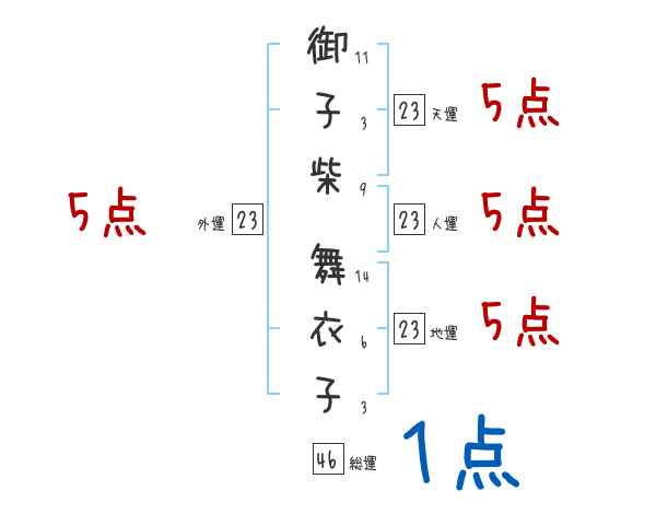 天運![]() | 御子柴舞衣子さんの天運は23画の5つ星!想像力に優れ活力がある。一代で成功し名誉を手に入れる。 家系が持つ宿命的な運勢を表します。祖先から受け継いだ苗字ですので自分の力が及びません。家柄を象徴します。 |