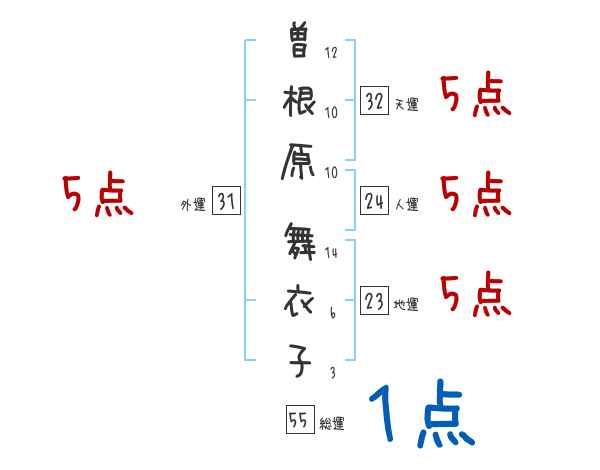 天運![]() | 曽根原舞衣子さんの天運は32画の5つ星!柔軟性があり成功する。チャンスが多く金運が良い。 家系が持つ宿命的な運勢を表します。祖先から受け継いだ苗字ですので自分の力が及びません。家柄を象徴します。 |