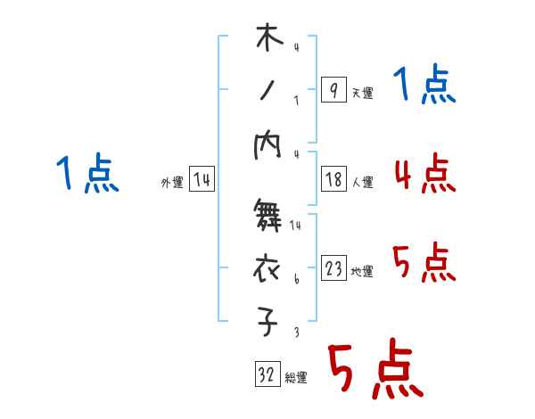 天運![]() | 木ノ内舞衣子さんの天運は9画の1つ星!消極的で才能を発揮することが苦手なことも。周りの意見に耳を傾けましょう。 家系が持つ宿命的な運勢を表します。祖先から受け継いだ苗字ですので自分の力が及びません。家柄を象徴します。 |