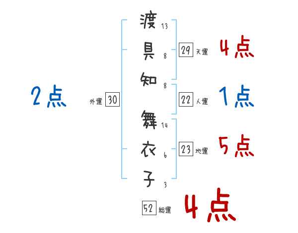 天運![]() | 渡具知舞衣子さんの天運は29画の4つ星!完全主義で才能がある。厳格な心の持ち主。 家系が持つ宿命的な運勢を表します。祖先から受け継いだ苗字ですので自分の力が及びません。家柄を象徴します。 |