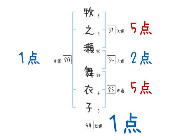天運![]() | 牧之瀬舞衣子さんの天運は31画の5つ星!社交性があり判断力に優れる。順風満帆な人生で円満な生活。 家系が持つ宿命的な運勢を表します。祖先から受け継いだ苗字ですので自分の力が及びません。家柄を象徴します。 |