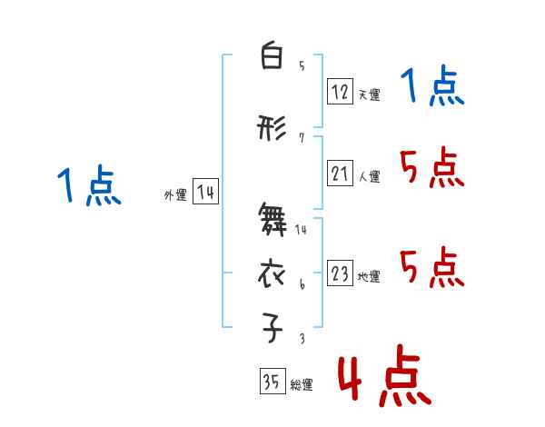 外運![]() | 白形舞衣子さんの外運は14画の1つ星!人に対して優しいがストレスを溜め込みがち。人間関係のトラブルを避けるよう気をつけましょう。 生活面を象徴する運勢です。外部から受ける影響力を表し、結婚運、家庭運や職場、環境への順応性を表します。 |