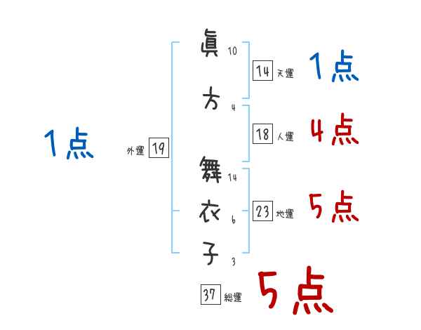 人運![]() | 眞方舞衣子さんの人運は18画の4つ星!情熱的で剛気。忍耐力があり信頼される。 性格や才能などを表す2番目に重要な運勢です。人間関係や協調性、社会的な成功に影響します。主に20歳から50歳ぐらいまでの中年期の運勢を表します。 |