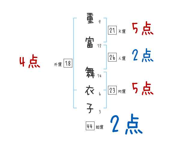天運![]() | 重富舞衣子さんの天運は21画の5つ星!統率力がある。独立し成功する。名誉を手に入れる。 家系が持つ宿命的な運勢を表します。祖先から受け継いだ苗字ですので自分の力が及びません。家柄を象徴します。 |