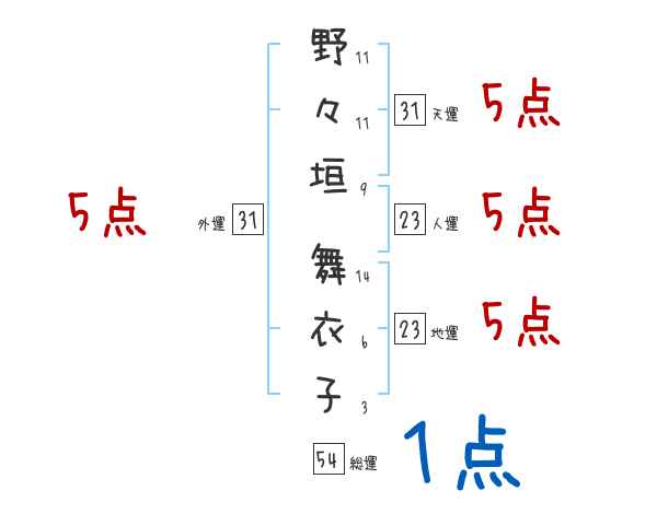人運![]() | 野々垣舞衣子さんの人運は23画の5つ星!想像力に優れ活力がある。一代で成功し名誉を手に入れる。 性格や才能などを表す2番目に重要な運勢です。人間関係や協調性、社会的な成功に影響します。主に20歳から50歳ぐらいまでの中年期の運勢を表します。 |