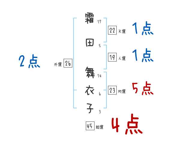 外運![]() | 霜田舞衣子さんの外運は26画の2つ星!波瀾万丈かも。信頼できる人を大事にしましょう。 生活面を象徴する運勢です。外部から受ける影響力を表し、結婚運、家庭運や職場、環境への順応性を表します。 |