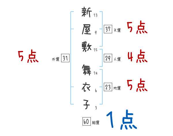 天運![]() | 新屋敷舞衣子さんの天運は37画の5つ星!努力家で順応性に優れる。現実的な考え方ができ忠実に物事をこなす。 家系が持つ宿命的な運勢を表します。祖先から受け継いだ苗字ですので自分の力が及びません。家柄を象徴します。 |