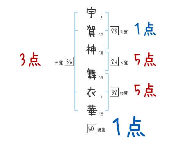 天運![]() | 宇賀神舞衣華さんの天運は28画の1つ星!家庭環境に注意。スポーツで活躍できる能力があるかも。 家系が持つ宿命的な運勢を表します。祖先から受け継いだ苗字ですので自分の力が及びません。家柄を象徴します。 |