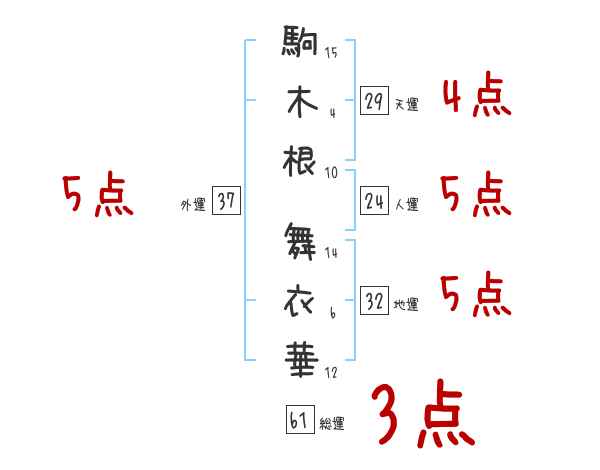 外運![]() | 駒木根舞衣華さんの外運は37画の5つ星!努力家で順応性に優れる。現実的な考え方ができ忠実に物事をこなす。 生活面を象徴する運勢です。外部から受ける影響力を表し、結婚運、家庭運や職場、環境への順応性を表します。 |