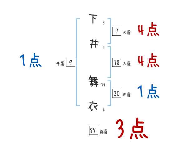 天運![]() | 下井舞衣さんの天運は7画の4つ星!強い意志や信念を持ち独立心が強い。自立する。 家系が持つ宿命的な運勢を表します。祖先から受け継いだ苗字ですので自分の力が及びません。家柄を象徴します。 |