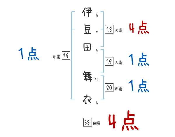 外運![]() | 伊豆田舞衣さんの外運は19画の1つ星!優れた才能を持ちますが、協調性が足りないことも。周りの人と協力する事を意識しましょう。 生活面を象徴する運勢です。外部から受ける影響力を表し、結婚運、家庭運や職場、環境への順応性を表します。 |