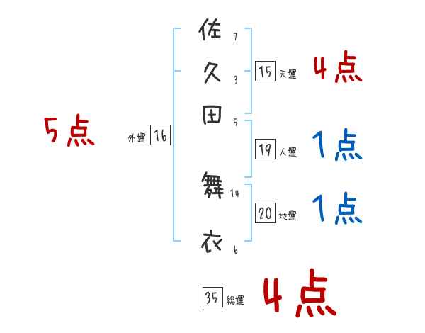 外運![]() | 佐久田舞衣さんの外運は16画の5つ星!人望が厚く大きく発展する。逆転成功が見える。 生活面を象徴する運勢です。外部から受ける影響力を表し、結婚運、家庭運や職場、環境への順応性を表します。 |