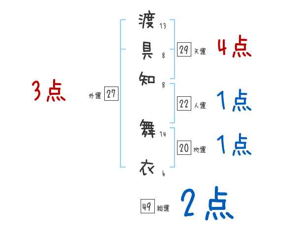 外運![]() | 渡具知舞衣さんの外運は27画の3つ星!頭脳明晰だが強情で摩擦が多い傾向。孤立に注意。 生活面を象徴する運勢です。外部から受ける影響力を表し、結婚運、家庭運や職場、環境への順応性を表します。 |