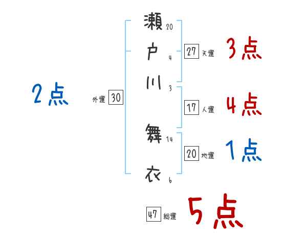 総運![]() | 瀬戸川舞衣さんの総運は47画の5つ星!実力が開花し発展する円満な人生。財に恵まれる。 あなたの人生を表す1番重要な運勢です。生涯を通じて影響する総合運となり、主に50歳以降の晩年期に影響を及ぼします。 |