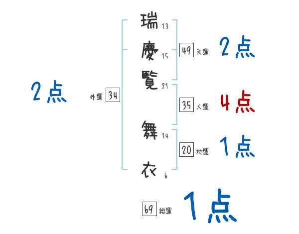 天運![]() | 瑞慶覧舞衣さんの天運は49画の2つ星!不安定な性格で明暗がある人生。周りの人には支援されやすい。 家系が持つ宿命的な運勢を表します。祖先から受け継いだ苗字ですので自分の力が及びません。家柄を象徴します。 |